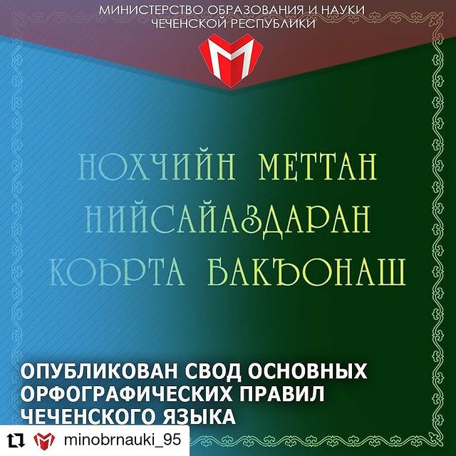 18.12.2020Министерство образования и науки Чеченской РеспубликиПрезентация издания состоялась в г. Грозном 18 декабря 2020 года в зале Национальной библиотеки им. Айдамирова А.А.Издание представляет собой результат совместной работы известных ученых-лингвистов, преподавателей, методистов, писателей, учителей-практиков (Экспертная группа при Главе ЧР по сохранению и развитию чеченского языка).В работе представлено обоснование предлагаемому написанию существительных, глаголов, деепричастий и их форм, сложных числительных, местоимений, союзов, частиц, разъяснены правила слитного написания и через дефис, особенности написания сложных слов и оборотов, ударных и безударных, перенос слов и другие.По мнению авторов, данный свод позволит выработать единые требования при изучении языка и положит конец разночтениям и толкованиям разного рода. Издание опубликовано на официальном сайте Министерства образования и науки ЧР mon95.ru и на сайте Института развития чеченского языка и истории umhiyai.ru.Глава Чеченской Республики, Герой России Рамзан Ахматович Кадыров ранее подписал Указ «Об утверждении Свода основных орфографических правил чеченского языка». Документ был принят в целях сохранения и развития национального языка чеченского народа.Для обеспечения актуализации свода был привлечён Экспертный совет по сохранению и развитию чеченского языка при Главе Чеченской Республики. Институту развития чеченского языка и истории было поручено внести изменения в план научно-исследовательской работы с учётом подготовки проекта Большого орфографического словаря чеченского языка.