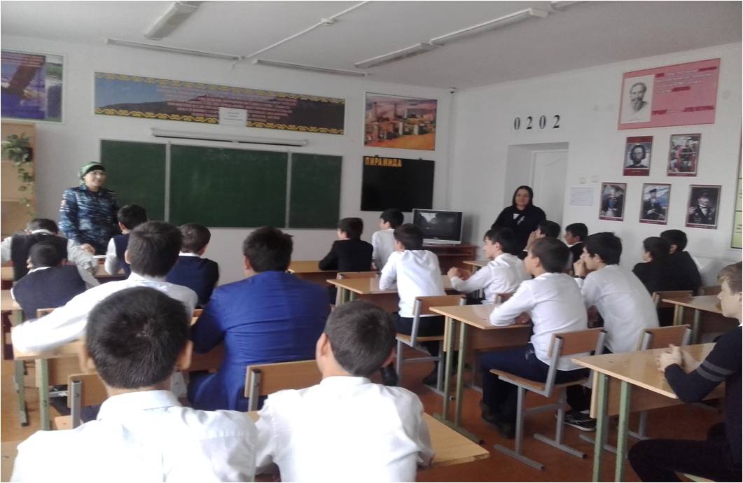 01.12.201601.12.2016 г. в МБОУ « СОШ с. Айти-Мохк» инспектор по делам несовершеннолетних, лейтенант полиции - Маидова Малика Ахъядовна, провела профилактическую беседу с обучающимися старших классов по профилактике правонарушений среди несовершеннолетних. Она ознакомила детей о последствиях правонарушений. И отметила, что за преступлением следует наказание, каждый в ответе за свои поступки.
