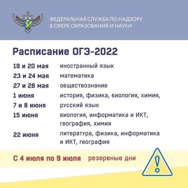 05.05.2022Совместным приказом Минпросвещения РФ и Рособрнадзора утверждены изменения в расписание основного государственного экзамена (ОГЭ) для выпускников 9 классов в 2022 году. 14 апреля документ был зарегистрирован Минюстом РФ. Новое расписание предусматривает по два дня для проведения наиболее массовых экзаменов (по русскому языку, математике и обществознанию) в основной период. Решение о проведении экзаменов в один или два дня будет приниматься субъектами РФ самостоятельно исходя из их организационных, кадровых и технологических ресурсов. В соответствии с утвержденным расписанием, в основной период ОГЭ пройдет: 19 и 20 мая – по иностранным языкам; 23 и 24 мая – по математике; 27 и 28 мая – по обществознанию; 1 июня – по истории, физике, биологии и химии; 7 и 8 июня – по русскому языку; 15 июня – по биологии, информатике и ИКТ, географии и химии; 22 июня – по литературе, физике, информатике и ИКТ, географии. С 4 июля по 9 июля в расписании предусмотрены резервные дни для сдачи ОГЭ по всем предметам