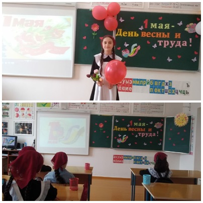 30.04.2022В 4-ом классе провели классный час на тему "1 мая - День весны и труда!" Цели: -формирование у учащихся знаний о празднике 1 мая; -воспитывать уважительное отношение к людям разных профессий; - способствовать нравственно-патриотическому воспитанию школьников, воспитывать любовь и уважение к своему народу. Кл. рук.: Дениева И.И.