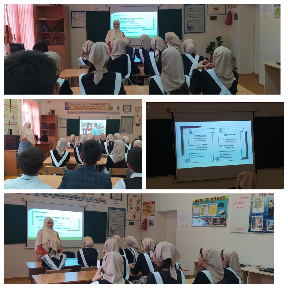 03.10.2022ФГБОУ ВО «Чеченский государственный университет им. А.А. Кадырова» в очередной раз проводит универсиаду среди обучающихся 11 класса. 3 октября 2022 года,нашу школу посетила студентка филологического факультета Мусаева Селима, которая провела профориентационную работу с обучающимися 9-11 классов. Помимо общей информации о структуре и деятельности университета, ученикам была предоставлена информация о филологическом факультете, о специальностях и специализациях, условиях поступления, проходных баллах, особенностях обучения и перспективах дальнейшего трудоустройства. Затем Селима провела школьный этап Университетской олимпиады по чеченскому языку и чеченской литературе, в котором приняли участие 2 обучающихся 11 класса. Один обучающийся из участников хочет поступить после школы именно на филологический факультет ЧГУ. Мы от всей души пожелаем нашей Ахмадовой Мадине успеха и достижения своей цели! И от всей души хочется сказать спасибо организаторам этой олимпиады! Дала аьтто бойла вайн берийн а,вайн а!