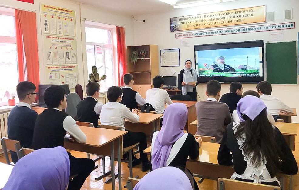 09.01.2024В МБОУ «СОШ с. Айти-Мохк» классный руководитель 7 класса Вашаева Шовда Салавидиновна провела урок на тему : «День восстановления государственности чеченского народа» Цель: 1. Ознакомить с историей чеченского народа. 2. Привить любовь к Родине. 3. Привить чувство гордости за народ ,город в котором живем. 9 января 1957 года Президиум Верховного Совета СССР принял Указ «О восстановлении ЧИАССР в составе РСФСР». Это событие дало возможность депортированным в 1944 году в Казахстан и Среднюю Азию чеченцам и ингушам вернуться на свою историческую Родину. В 2010 году глава ЧР Рамзан Кадыров подписал указ, в соответствии с которым 9 января в Чеченской Республике отмечается как День восстановления государственности чеченского народа.