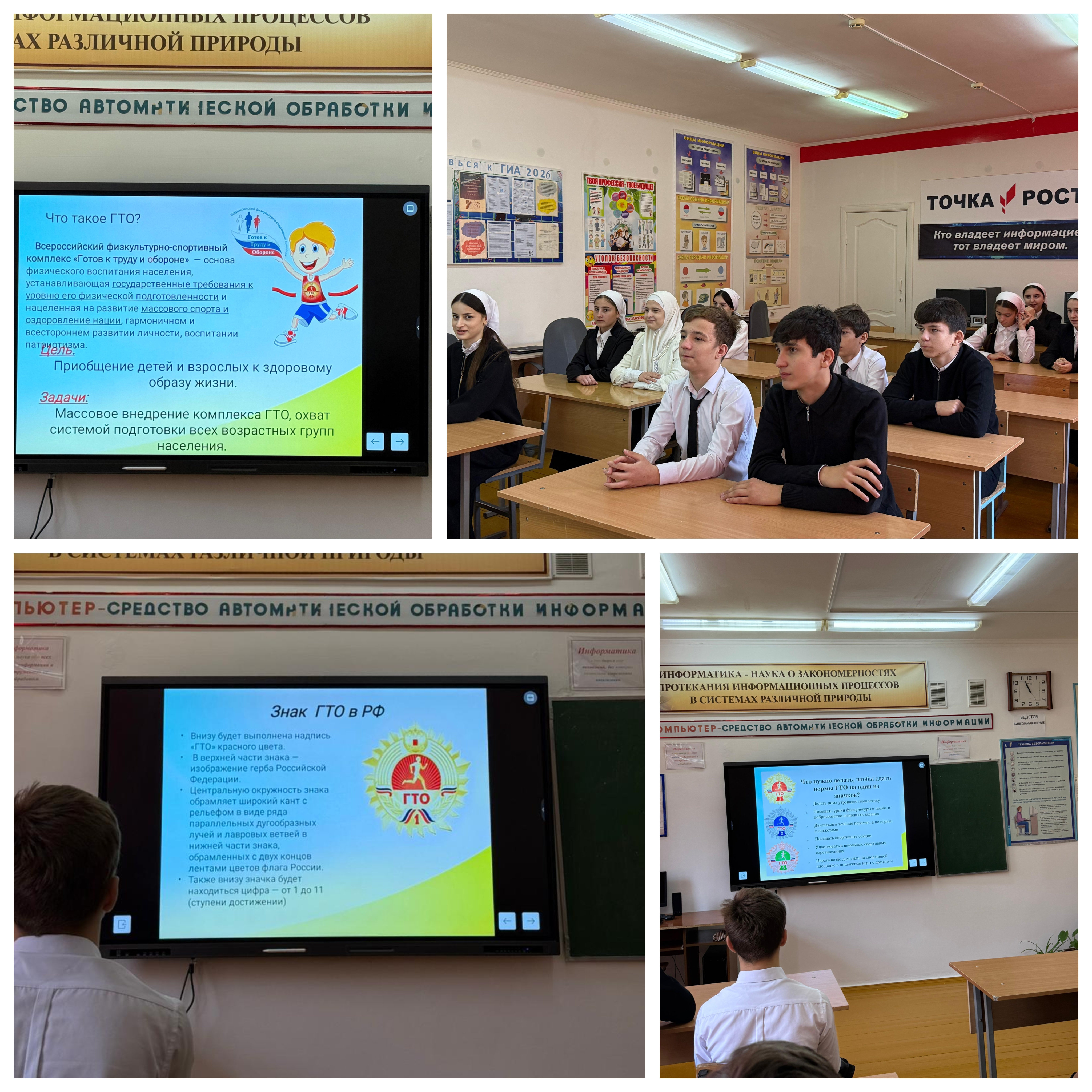 Учитель физической культуры Ахматукаев Р.Б. познакомил учеников с историей ГТО. В ходе мероприятия ребята познакомились с презентацией по истории, становлению и развитию комплекса ГТО в нашей стране, нормативами выполнения физкультурно-спортивного комплекса «Готов к труду и обороне». Они узнали, что комплекс «ГТО» предназначен для повышения уровня физической подготовленности, самосовершенствования и поддержания здорового образа жизни. В заключение были сделаны выводы. для чего нужно стремиться молодежи 21 века к выполнению нормативов ГТО, к получению знаков отличия? Ответы получились разные: кто-то хочет достичь конкретного результата и проверить свою силу воли и настойчивость, кто-то привык быть всегда первым в учебе и спорте, кто-то заботится о своем здоровье. Но все ребята сошлись во мнении, что комплекс ГТО необходим нам, современным людям. Ведь только целеустремленные физически подготовленные люди смогут добиться успеха!